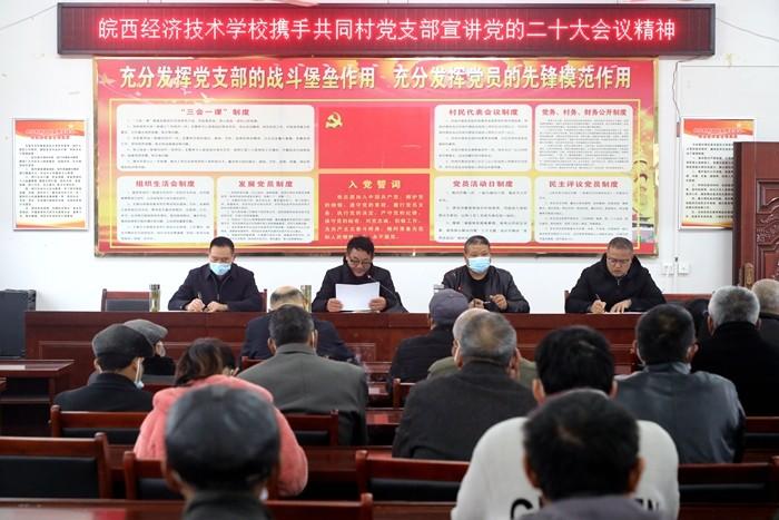 为全面深入学习、宣传党的二十大精神,引导广大人民群众把思想和行动统一到党的二十大精神上来,11月23号上午,皖西经济技术学校党委书记、校长王秀江带队前往霍邱县岔路镇共同村,深入村组宣讲党的二十大精神,并调研乡村振兴工作,校党委副书记来春富陪同宣讲调研。 在共同村党员活动室,坐满了前来听讲的村民,王秀江书记向大家宣讲党的二十大精神。王秀江围绕“二十大的主题”“过去五年和新时代十年的伟大成就”“马克思主义中国化、现代化”“中国式现代化”“全面建设社会主义现代化的部署”“坚持党的全面领导和从严治党”五个方面全面系统地宣讲党的二十大会议精神。