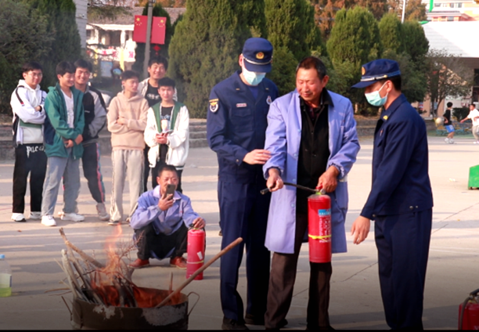 讲座结束后,县消防大队消防员在操场演示灭火器的使用及现场实操演练。