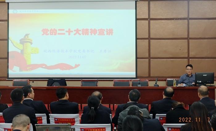 11月7日下午,皖西经济技术学校党委书记、校长王秀江在第一会议室作“学习宣传党的二十大精神”宣讲,全校教师参与学习。