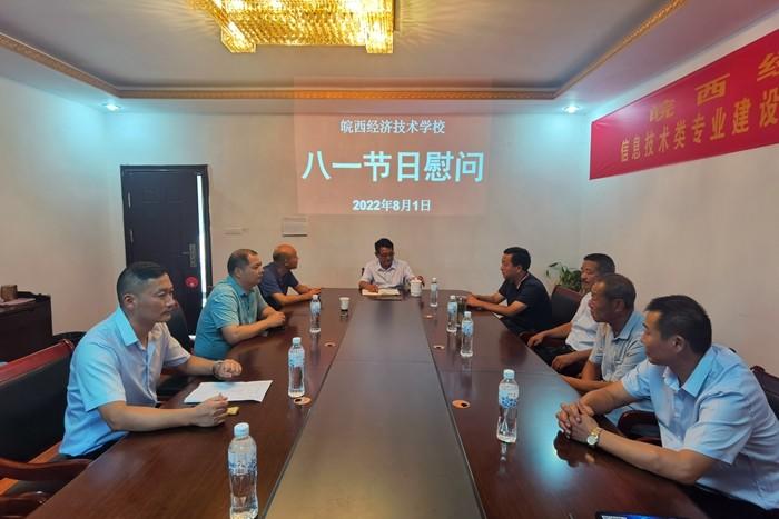 时值中国人民解放军建军95周年之际,8月1日下午,皖西经济技术学校在校第三会议室召开“八一”建军节慰问座谈会。学校党委书记 、校长王秀江,党委副书记来春富,政教处主任刘勇、副主任周吉成等与学校五位退役军人教职工开展慰问座谈。