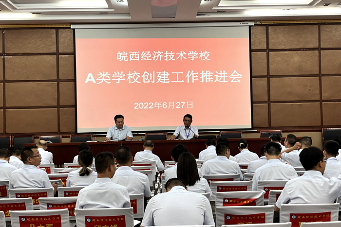 6月27日,皖西经济技术学校在第一会议室召开创建安徽省普通中等专业学校办学水平A类推进会,学校党委书记、校长王秀江及校领导班子成员、全体老师参加会议,会议由校党委委员、副校长贾仁宝主持。