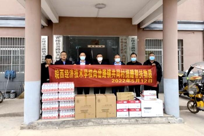 5月12日上午,皖西经济技术学校副校长李正局、培训部主任胡伟带着防疫、办公物质来到岔路镇共同村开展捐赠慰问活动,共同村主要领导及学校驻村专员参加了此次活动。