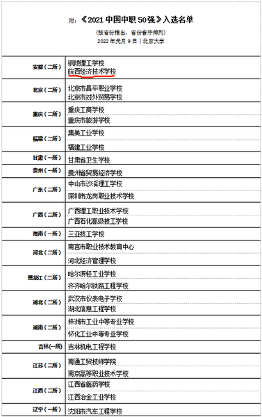 2022年1月9日,第六届中国职业教育百强发布会暨第六届职业教育论坛在北京大学召开?;嵘瞎剂?021年第六届中国职业教育百强入选名单。皖西经济技术学校成功入选中国职业教育百强、中国中职教育50强。