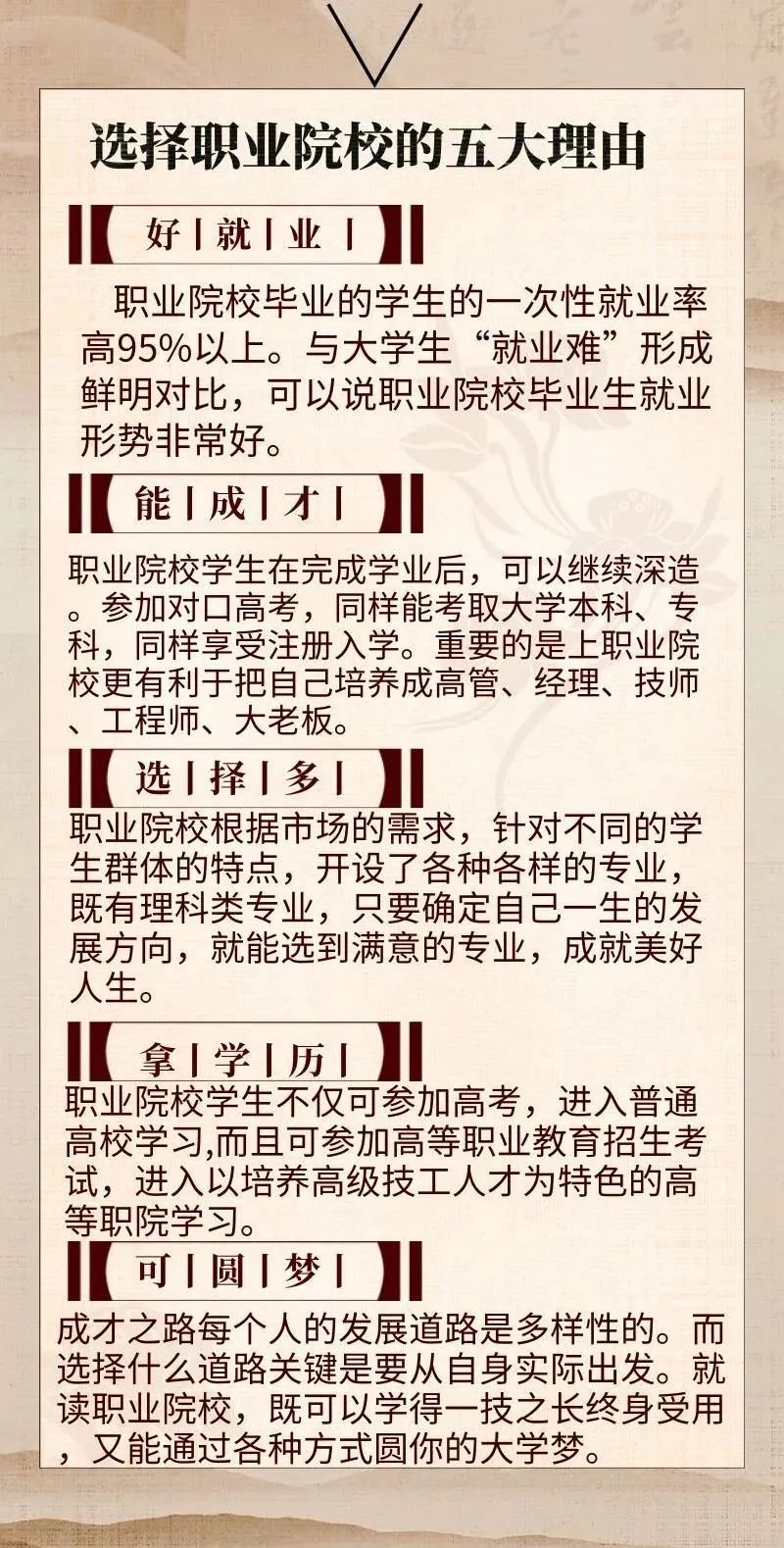 最后,建议各位家长根据学生的实际情况,做出合理的选择。不管是读中职还是读高中,相信家长和学生都有自己的想法,家长都渴望自己孩子都成才,但是成才的方式有很大种,只有选择适合自己孩子的发展方向才是对的,才能真的获得成功。