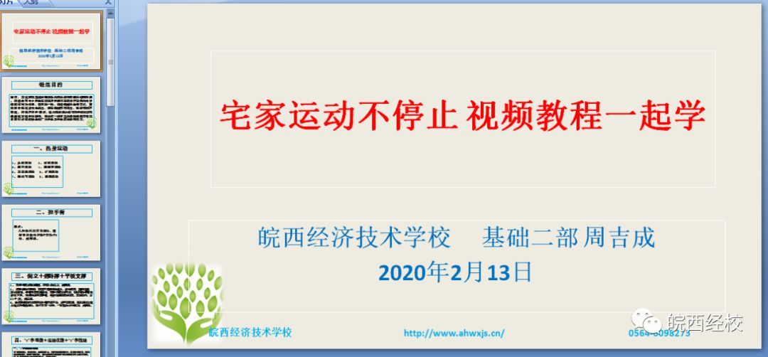 三、基础二部周吉成老师制作了《宅家运动不停止 视频教程一起学 》的课件,并拍成视频,图文并茂的亲自演示如何锻炼,引导学生保持健康的生活方式,劳逸结合提高身体免疫力,增强健康防范能力。