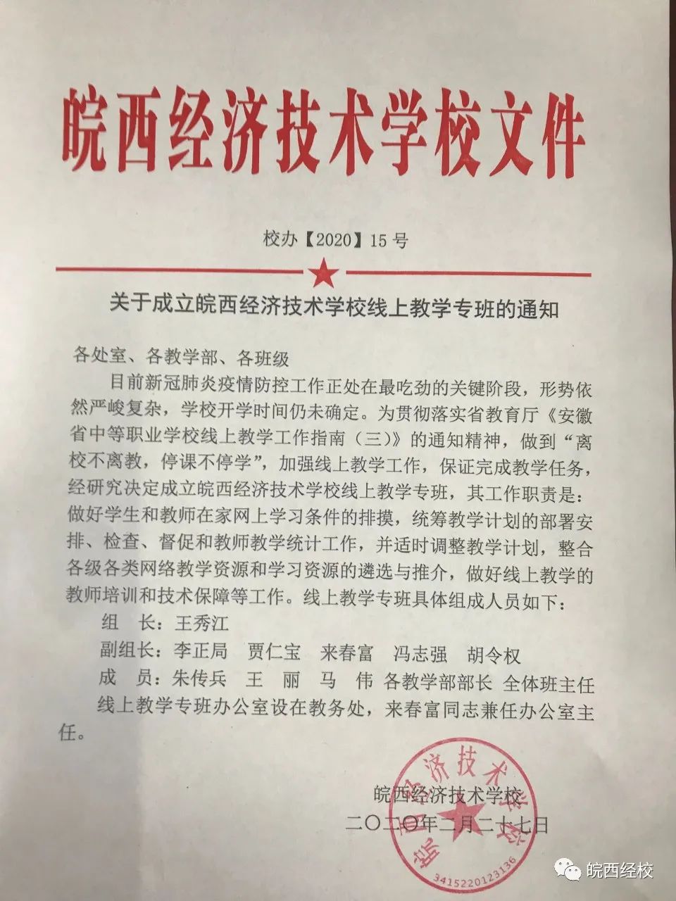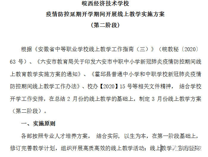 根据《安徽省中等职业学校线上教学工作指南(三)》(皖教秘〔2020〕63号)、《六安市教育局关于印发六安市中职中小学新冠肺炎疫情防控期间线上教育教学实施方案的通知》、《霍邱县普通中小学和中职学校新冠肺炎疫情防控期间线上教学工作办法》等相关文件精神, 按照学校开学工作安排,学校成立了线上教学专班,教务处在总结2月份的线上教学的基础上,制定3月份线上教学方案(第二阶段)。