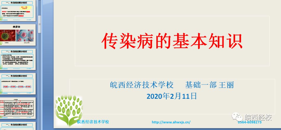 教务处紧密结合上级教育部门的要求,规定了线上教学内容和时间。其中学生必修的通识内容有:一、卫生与保健王丽老师根据当前的疫情,结合专业学科,制作了《传染病的基本知识》课件,让学生对传染病有一个理性的了解,并指导学生做好防护,珍爱生命。