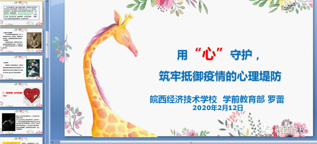 二、学前教育部罗蕾老师制作了《用心守护筑牢抵御疫情的堤防》课件, 对学生进行心理疏导,在这场无声的战役中,不仅要保护好身体的安全,更要打赢心理之战。