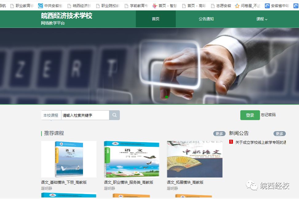 教务处向教师们推荐了智慧职教、学习通、腾讯课堂、QQ等教学平台,供老师们选择,学校信息中心搭建了“皖西经济技术学校在线学习”平台(网址:****)。