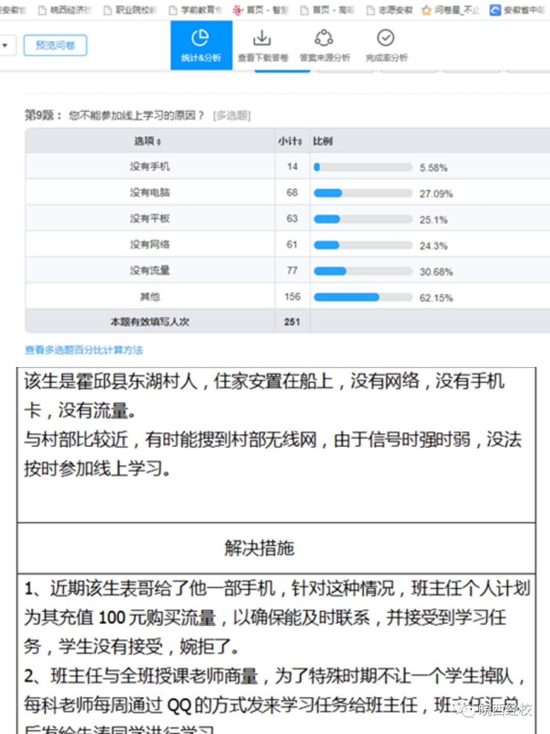 尤其是对于不具备线上学习条件的同学,学校逐一摸底,采取帮扶措施,由原来56位同学欠缺网络学习条件,在学校的帮扶下,最后只有一位同学,由于家庭客观原因,不能按时参加网络学习,学校也制定了一人一案,争取一个不掉队。