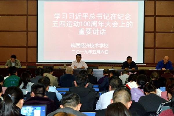 为纪念五四运动100周年,2019年5月6日,皖西经济技术学校组织全体教职工专题学习领会习近平总书记纪念五四运动100周年大会重要讲话精神。