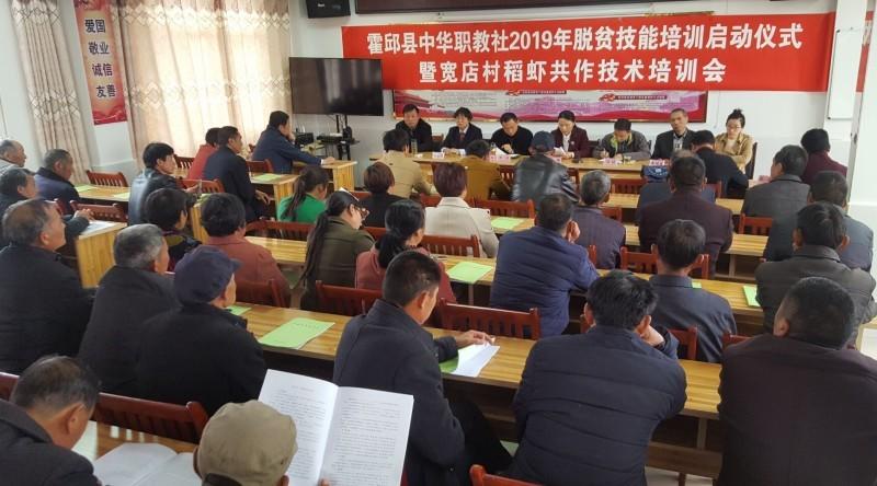 3月27日,县中华职教社在石店镇宽店村举行2019年脱贫技能培训启动仪式暨宽店村稻虾共作技术培训会。县人大常委会副主任县中华职教社主任任丽出席开幕式并讲话。市政协驻村扶贫工作队队长汤斌、石店镇相关负责人、霍邱工业学校、石店镇社员小组组长等以及该村90余名龙虾养殖户和贫困户农民参加仪式。