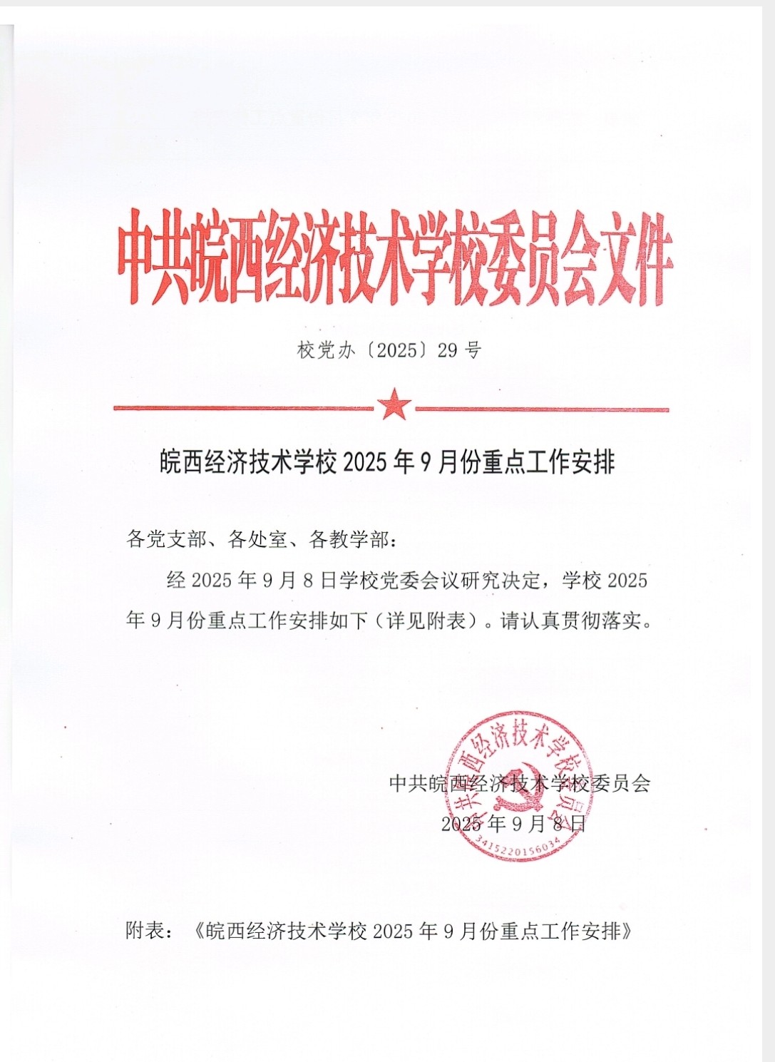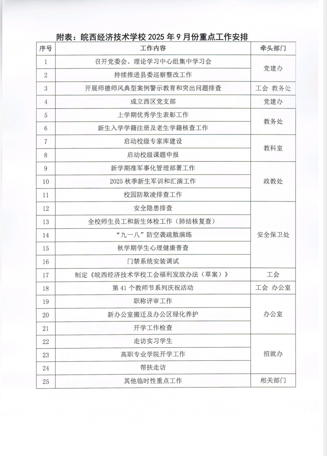 皖西经济技术学校2025年9月份重点工作安排